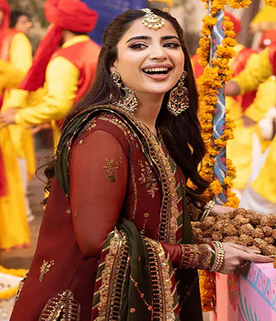 Its dupatta has a four-sided embroidered border with chan dispersed throughout in the same colour.