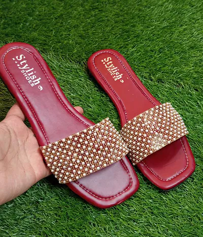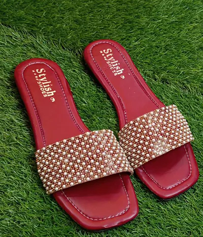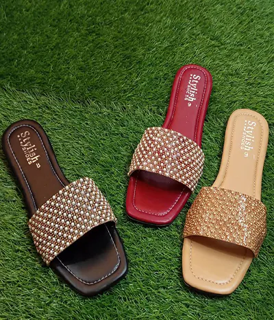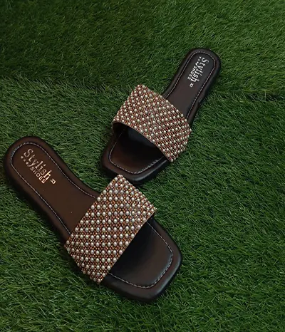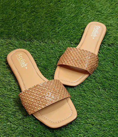 These chic slippers are ideal for both indoor and outdoor use. Their sleek rexine texture and sturdy rubber sole make them the perfect pick for any fashion-forward gathering. These slippers, which come in sophisticated golden and black hues, are an essential part of any wardrobe.