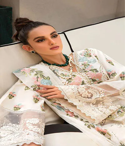 The front of the plain lawn is totally embroidered with scifflie and multi-thread work, and the neck is fully hand-worked. The two left and right embroidered bunches are attached by embroidered chak patties.