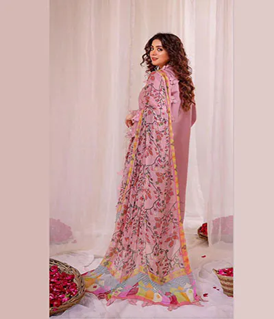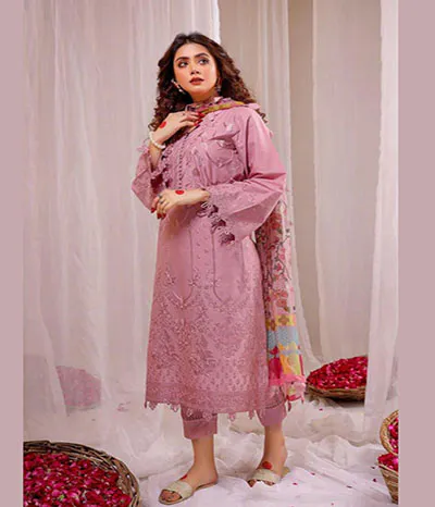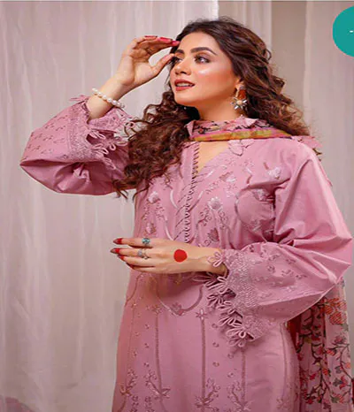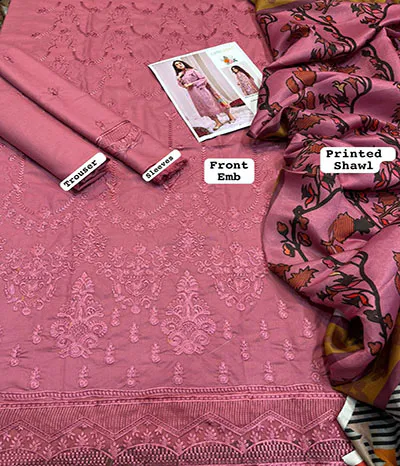 Three pieces of unstitched embroidered winter dhanak fabric Limelight. Shirt has an embroidered neckline, printed sleeves, and a printed back; Printed Dhanak Dupatta; Wool Shawl with Dhanak Trousers