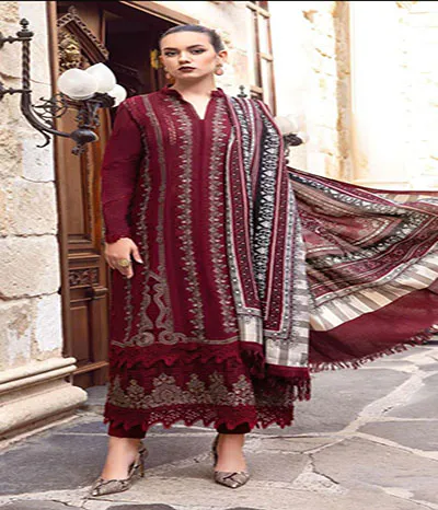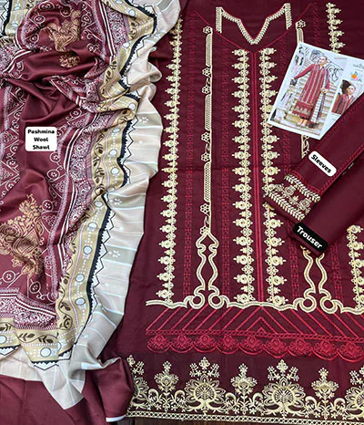 Beautiful dhanak fabric stuff for winter three-piece canvas with elegant embroidery and a solid red color scheme that retains your comfort and style appropriate for the season.