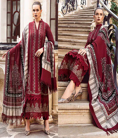 dhanak fabric stuff for winter Maria B’s hit code is available on Dhanak with a three-piece suit (shirt and dopatta trousers) and a pashmina wool shawl.