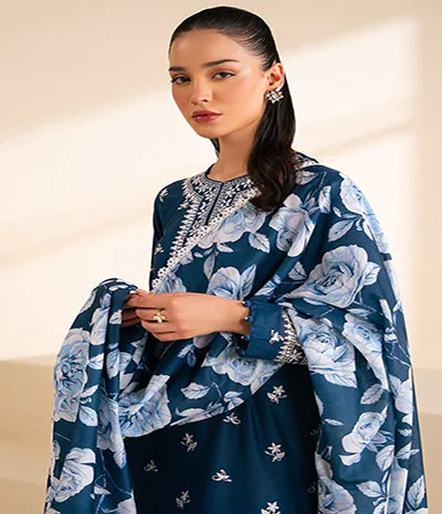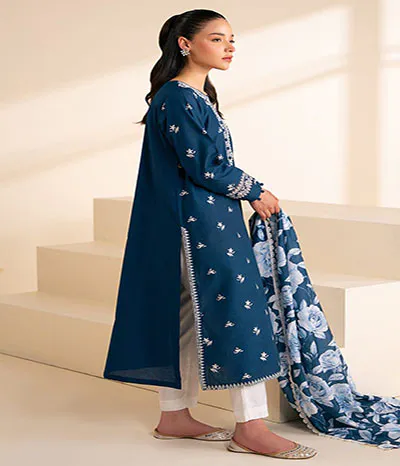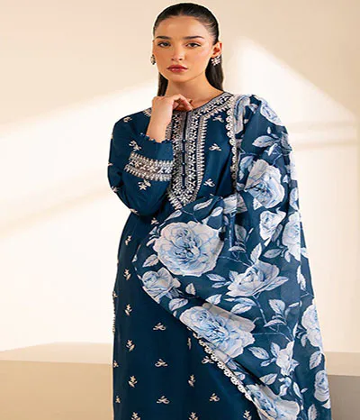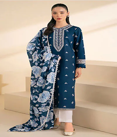 The captivating blue three-piece ready-to-wear design from sastabazzar.com . Solids line is evocative of the calm winter skies.for dhanak fabric stuff for winters dress ladies or girls.