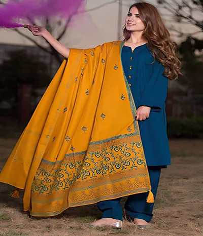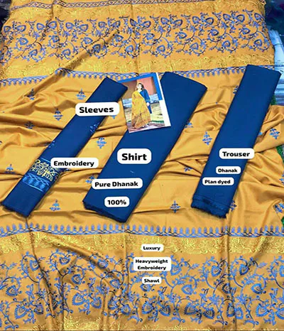 Three-piece, fully embroidered, unstitched dhanak fabric stuff winter fabric with a hefty, luxurious embroidery shawl