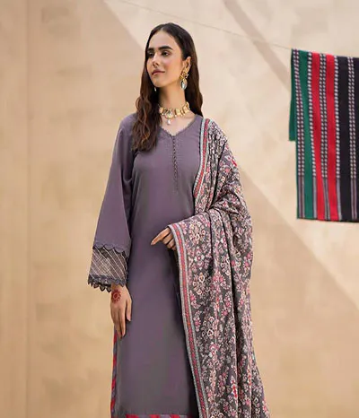 dhanak sale unstitched 3 pcs with totally embroidered Daman sleeves, heavy embroidery on the front, and a fully embroidered Shawll on the back, all made of DHANAK fabric.