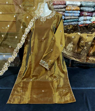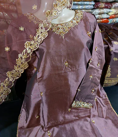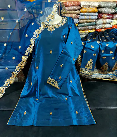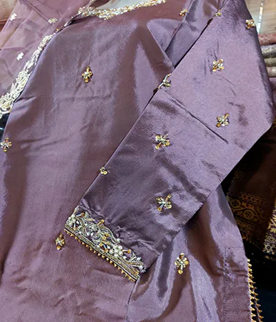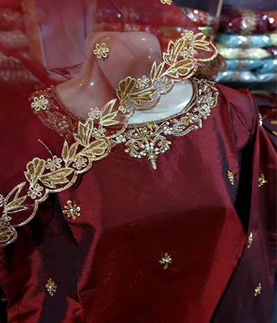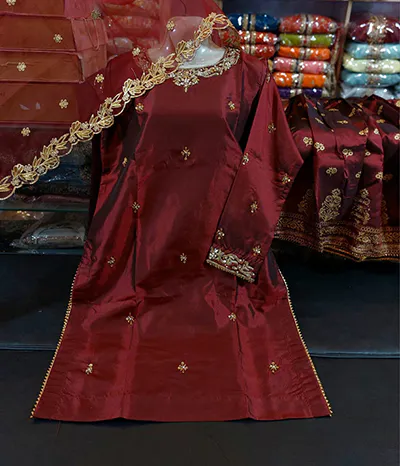 Handicrafts using dabka, AARI, Cora, and pearls and stones.