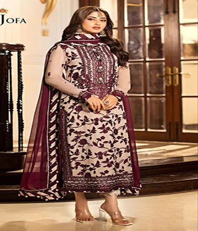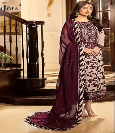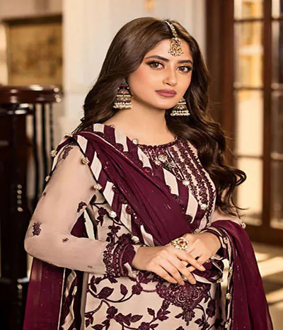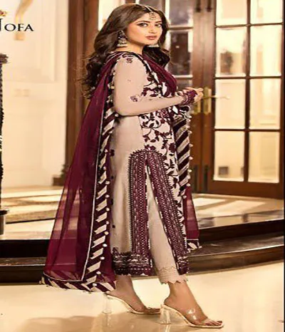 Chiffon completely covered in dense shaneel embroidery on the front, along with dense spengle work stitched along the neckline daman border including chak lace and embroidered spengle work