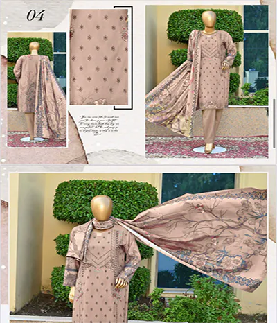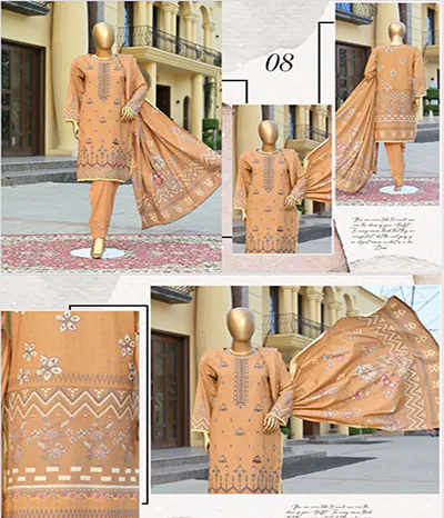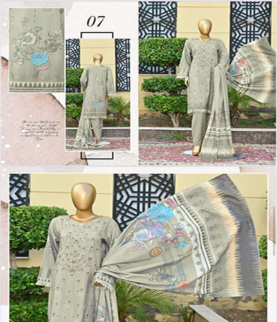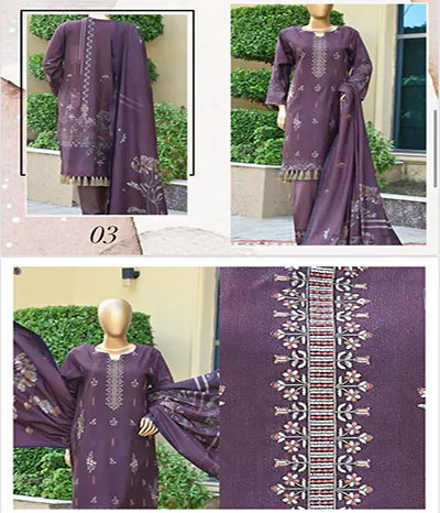 The Winter Collection 3PC DHANAK suit from the Unstitched Winter Dhanak Collection has embroidered front panels on the daman, sleeves, and neckline.
